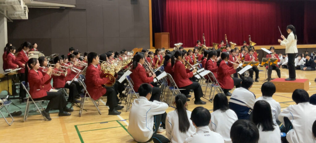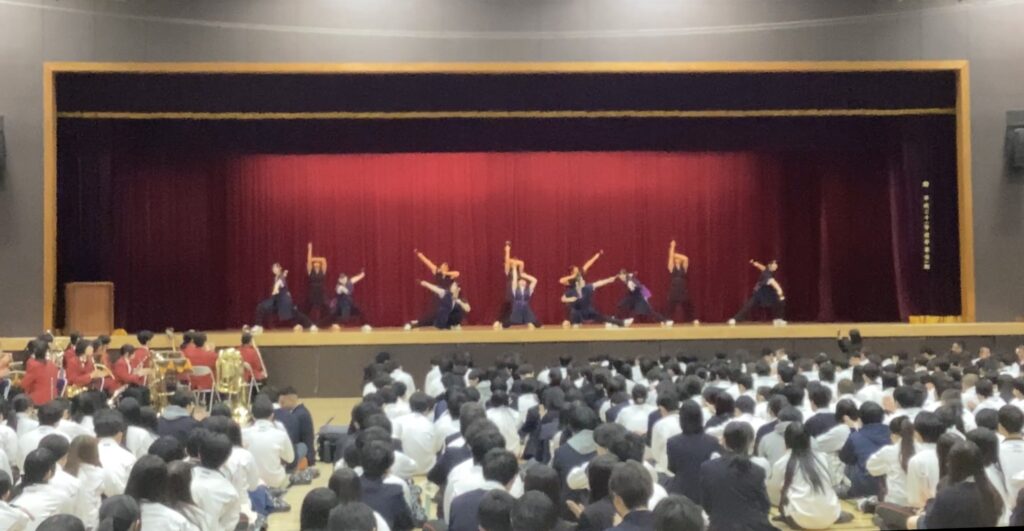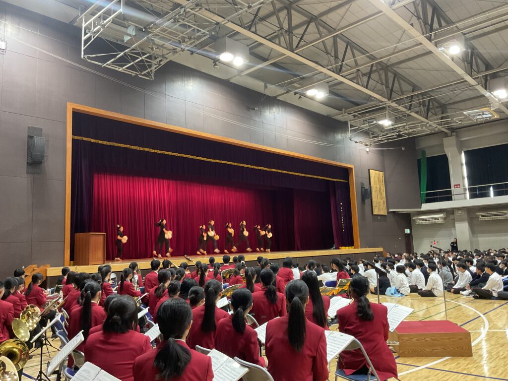 全校集会では、チャリティー・ミニコンサートが行われ、吹奏楽部・音楽部・チアダンス部が、12月20日に開催されるチャリティー・コンサートの演目の一部を披露しました。