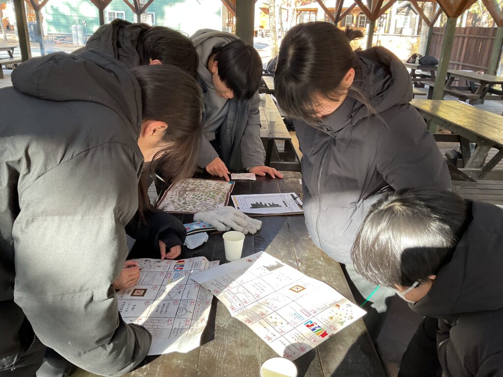 朝は森と湖に囲まれた楽園で朝食作り。みんなで協力し、爽やかな空気の中で美味しい朝食を楽しみました。その後、20のポイントに隠された宝を探す「トレジャーハンター」ゲームがスタート。各チームごとに工夫を凝らし、謎解きや探索に挑む姿はとても個性的でした。午後はクラスごとの班で自主研修。雄大な富士山を眺めながら、それぞれ自由な計画で大自然を満喫しました。一日を通して仲間と楽しみながら学び合う、充実した時間となりました。