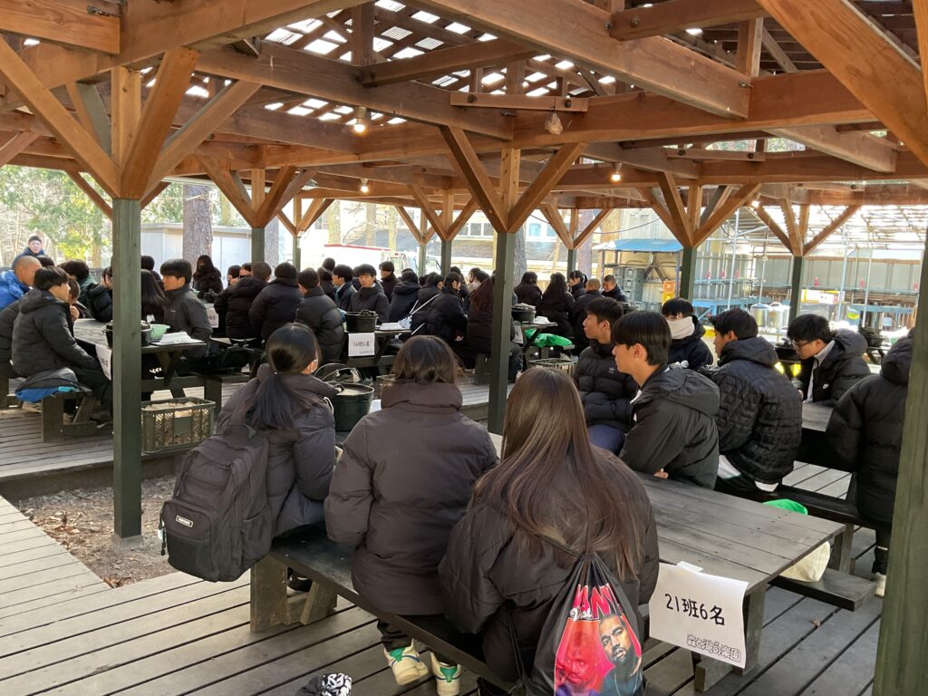 朝は森と湖に囲まれた楽園で朝食作り。みんなで協力し、爽やかな空気の中で美味しい朝食を楽しみました。その後、20のポイントに隠された宝を探す「トレジャーハンター」ゲームがスタート。各チームごとに工夫を凝らし、謎解きや探索に挑む姿はとても個性的でした。午後はクラスごとの班で自主研修。雄大な富士山を眺めながら、それぞれ自由な計画で大自然を満喫しました。一日を通して仲間と楽しみながら学び合う、充実した時間となりました。