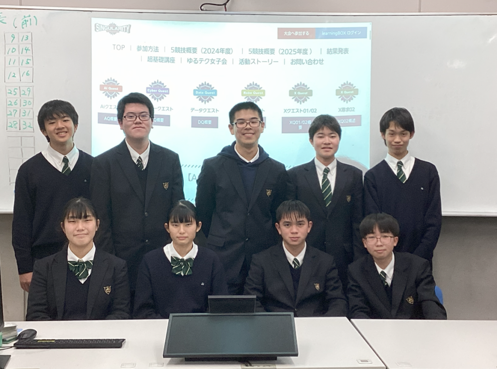 情報研究部では「第6回全国高等学校AIアスリート選手権大会シンギュラリティバトルクエスト2025」において, 9月の地区予選, 10月の2次選考を通過して決勝大会へ進出しました。決勝大会は2/1にオンラインで実施され、本校からはロボクエスト部門で2チーム(2年生2名、1年生4名)、AIクエスト部門で1チーム(1年生1名)、Xクエスト02部門で1チーム(1年生2名)が出場しました。残念ながらAIクエスト部門は1回戦敗退、Xクエスト02部門は入賞ならずでしたが、ロボクエスト部門では1チームが企業賞であるPE-BANK賞を受賞、1チームは優勝することができました。一昨年度の3位、昨年度の2位に続き、遂に優勝することができました!