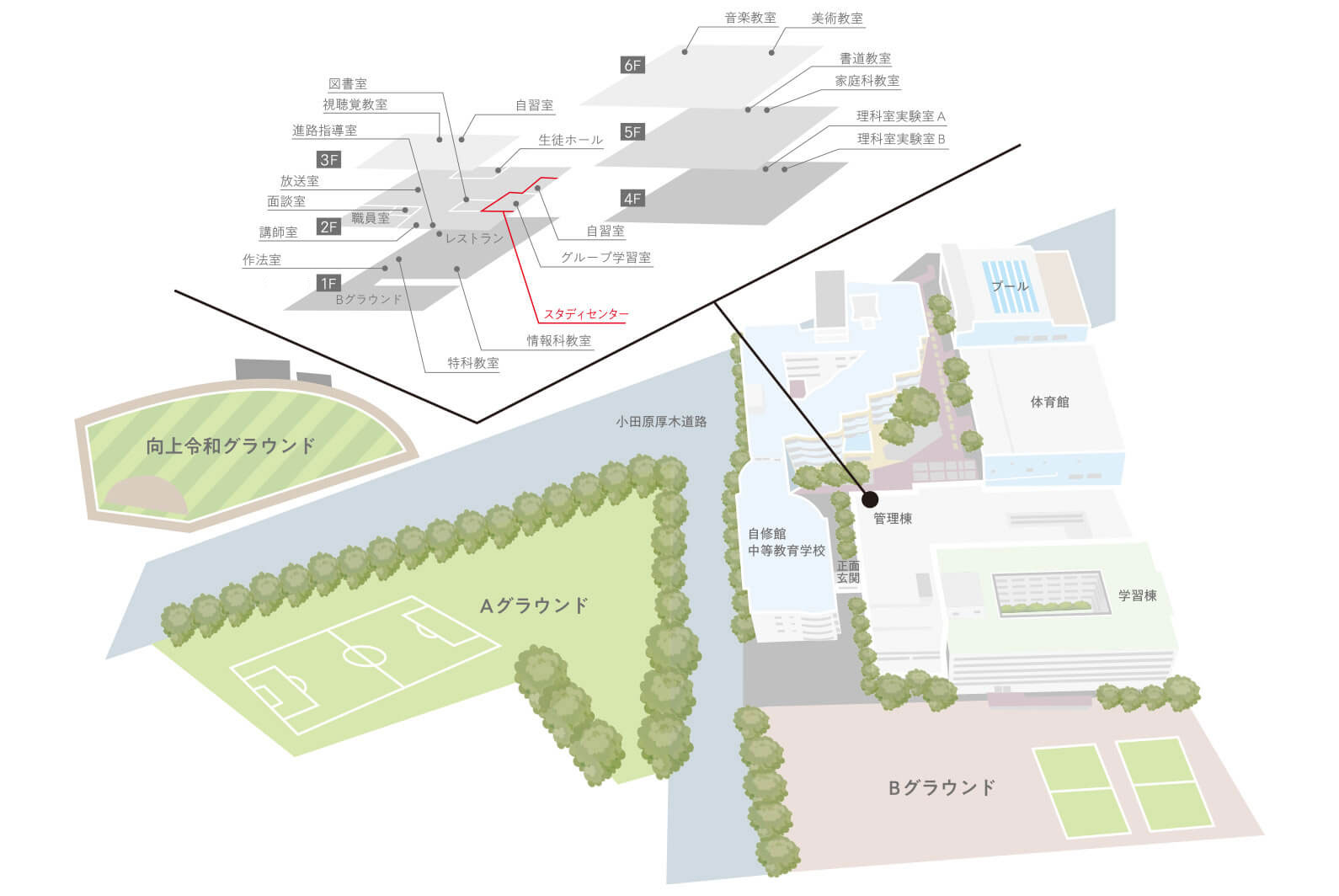 6階建ての校舎を中心に3つのグラウンドを有し、