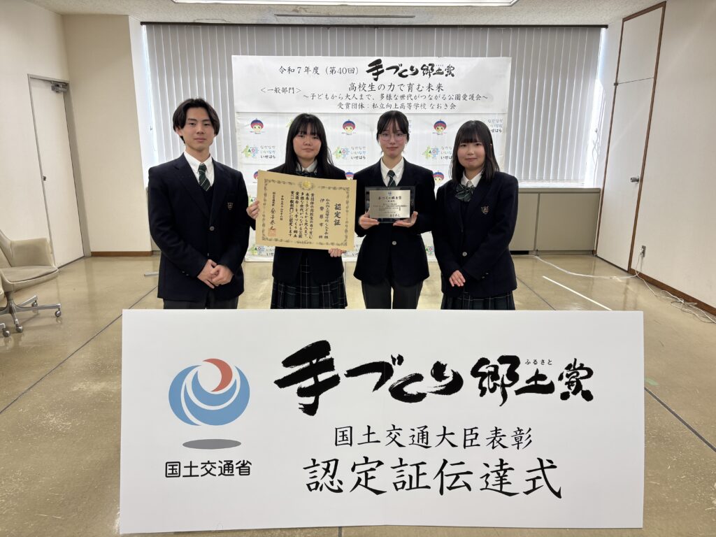 本校なおき会(生徒会)による地域連携の取り組みが継続的な活動として高く評価され「手づくり郷土賞」を受賞し、本日行われた認定証伝達式にはなおき会役員が参加しました。